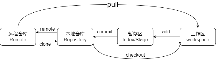 文件夹的另一个部分,即 git 自动创建的 master 分支。一般使用 commit 命令将暂存区文件添加到本地仓库; - 远程仓库(Remote):项目在远程 git 服务器上的存放位置,如通常使用的 github 仓库。可使用 clone 命令将项目从远程仓库克隆到本地仓库中, 也可使用 push 命令将本地项目推送到远程仓库。